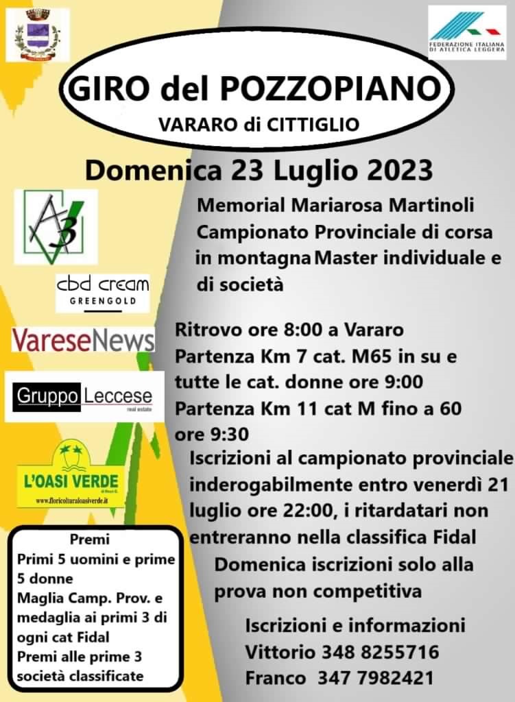Domenica 23.07 si svolge il GIRO DEL POZZOPIANO A VARARO (cittiglio) - prova valida come Campionato Provinciale individuale e di società di corsa in montagna.
